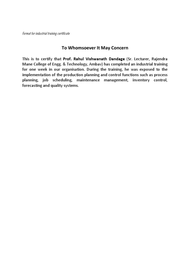 Format for industrial training certificate To Whomsoever It May Concern This is to certify that Prof. Also include why you are a good choice for the apprenticeship. The effective date of employment.
